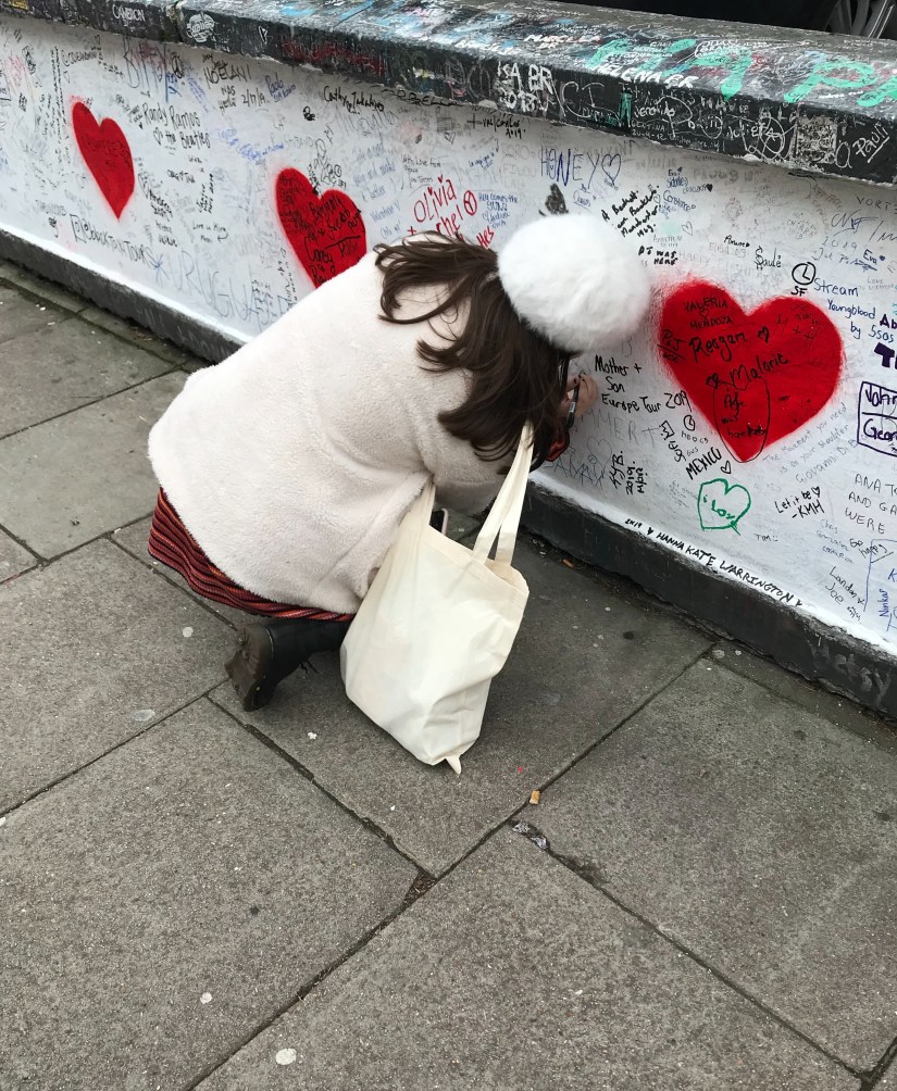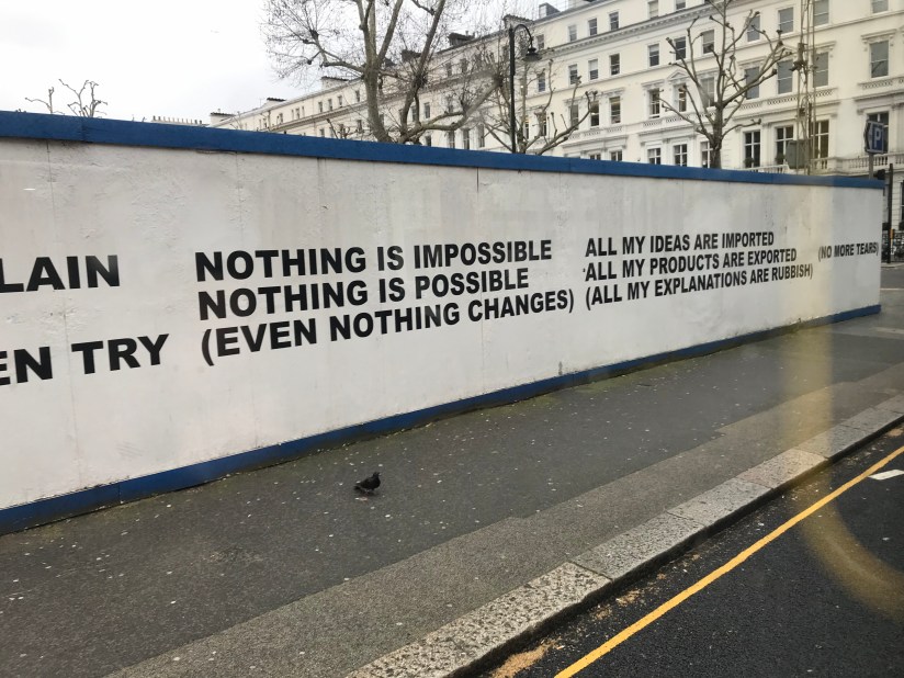 Since we had 2 full days to explore we decided to go full on tourist and bought tickets for the Big Bus. We took the local bus from right outside our flat to the city center where we took the Red Line tour (Piccadilly Circus, Big Ben, London Eye, Tower of London, London Bridge, etc…) atop the classic double decker. It was a great experience and we learned a lot from the tour guide. Once back in our neighborhood we walked to the pub – North London Tavern – which had great local Camden Brewery beer on tap AND an awesome vegan selection, which Amelia appreciated! Day two we got a lovely breakfast in the ‘hood and bussed back down into the city where we ventured into Kensington to the Victoria and Albert Museum, the Princess Diana Memorial Fountain, Hyde Park and Kensington Gardens. From the bus I saw this art installation, was intrigued by the concept of “even nothing changes”, took a picture and researched.