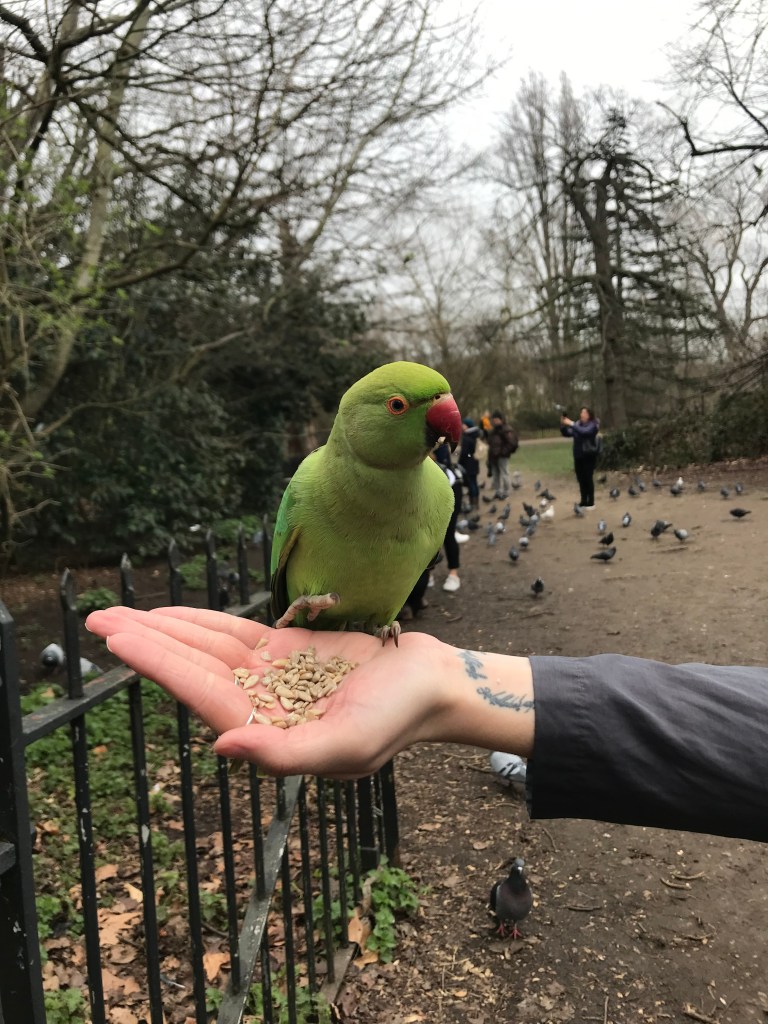 While in Kensington Gardens we came upon an area where parakeets were landing in people’s hands so they could have a bit of seed. So we joined the crowd and the girls had a great experience feeding the birds!