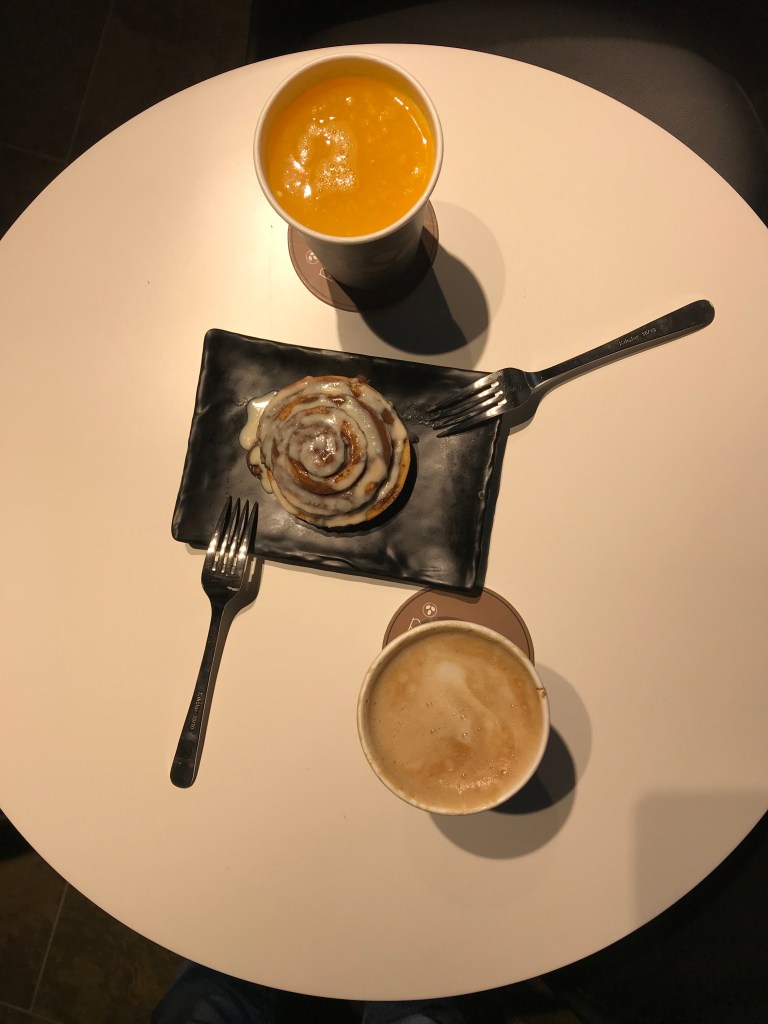 Our last Seven Pennies breakfast together – fresh orange juice, vanilla almond milk latte and a cinnamon bun to share!
