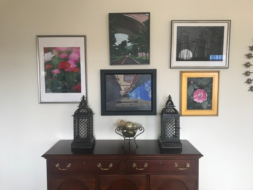 Yes, I know they are crooked! Bottom center is a place holder for the painting that I’m working on now! There is a (l to r) Dianne Smith (photograph), Caroline Murphy, Stanley Donwood print, Bobbi Baker and Dianne Smith