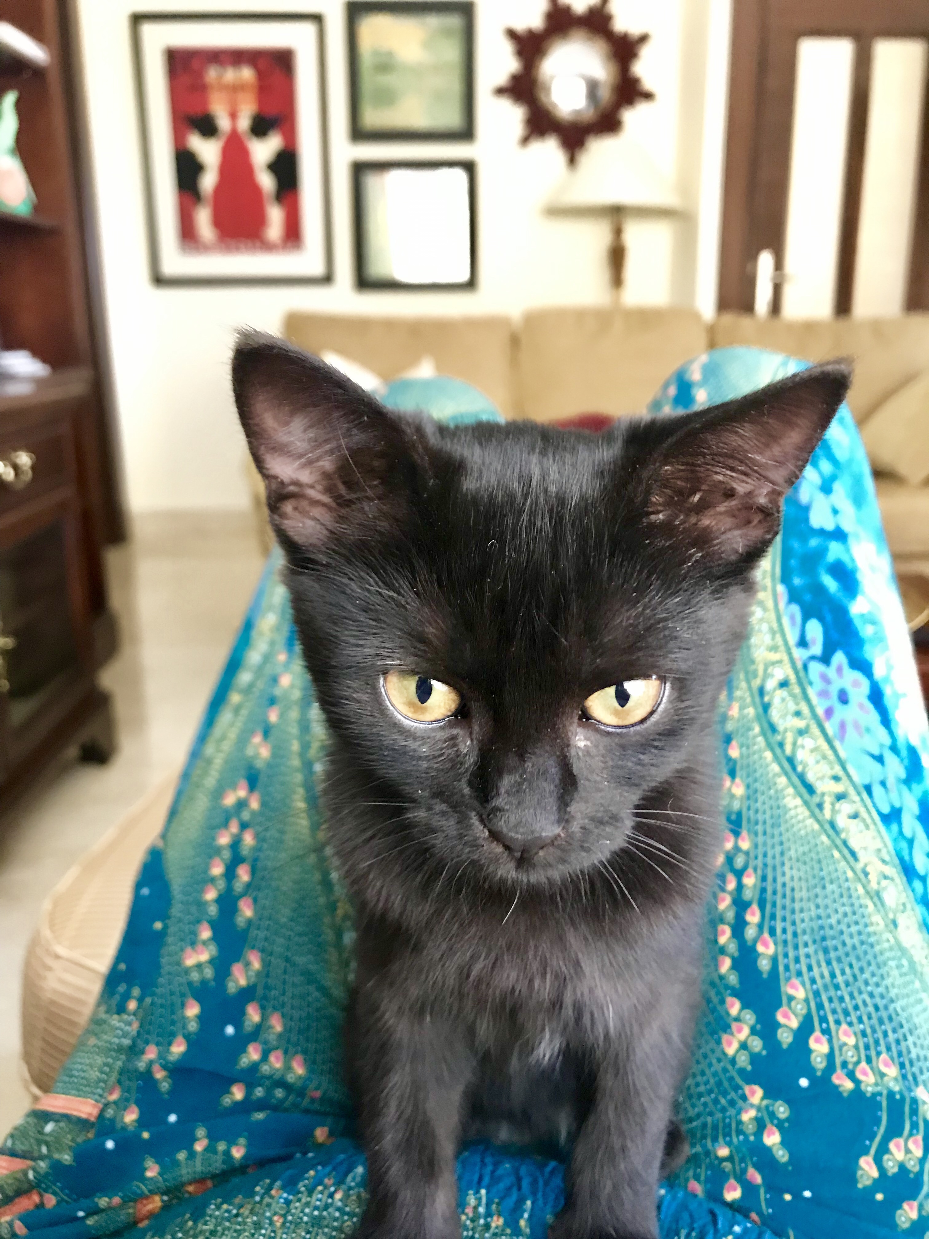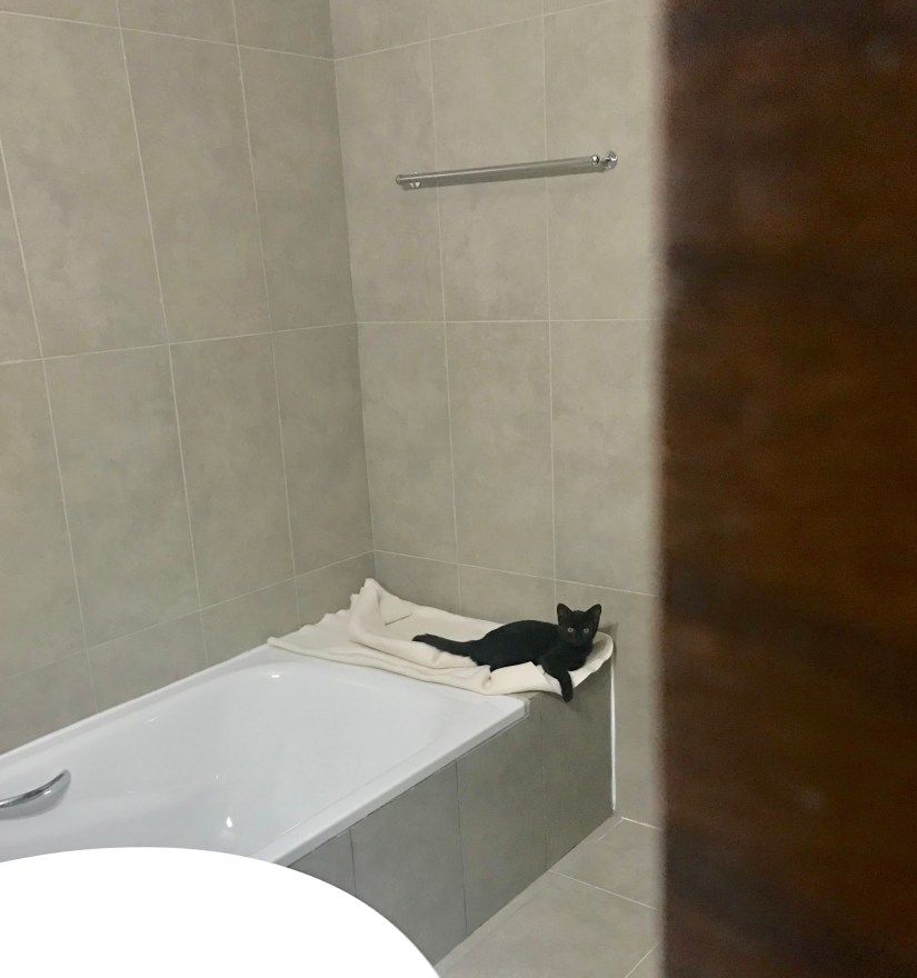 We went home that night and I kept talking about that little kitty we met, I texted the girls to tell them all about her and they both IMPLORED me to go back and catch her. At that point it was dark, I had nothing to feed her and no plan for her immediate care if I even could find her. I told them if she was there the next day I would do what I could. In the meantime I texted my new friend/veterinarian to ask him if I did catch her, could he come see her the next day – to which he replied “of course, my dear”. At lunchtime (I was home having lunch with Finn) Mike texted me to say the little kitty was back begging at the outdoor eatery so I raced over there to find her lounging under a table and drinking water from a bottle cap and I told her “if you are here when I am done at the gym tonight, you are coming home with me”. My friend gave me a kitty carrier, our neighbor loaned us a litter box, litter and food so I went down there after my workout and she wasn’t there because the eatery was closed. I looked around for her and didn’t see her so before I left I asked a man who sits at the back of the ambassador’s residence if he had seen a little black kitten around and he said “you mean that one over there?” and he pointed to a garden and there she was sitting pretty and I said “oh yes that’s the one” and she came running over to me so I scooped her up and held her at about arms length as she yelled and squirmed the whole way back to our place. I put her in one of the bathrooms – set up her litter box (she used it right away) and her food dishes (she chowed down) and hoped for the best.