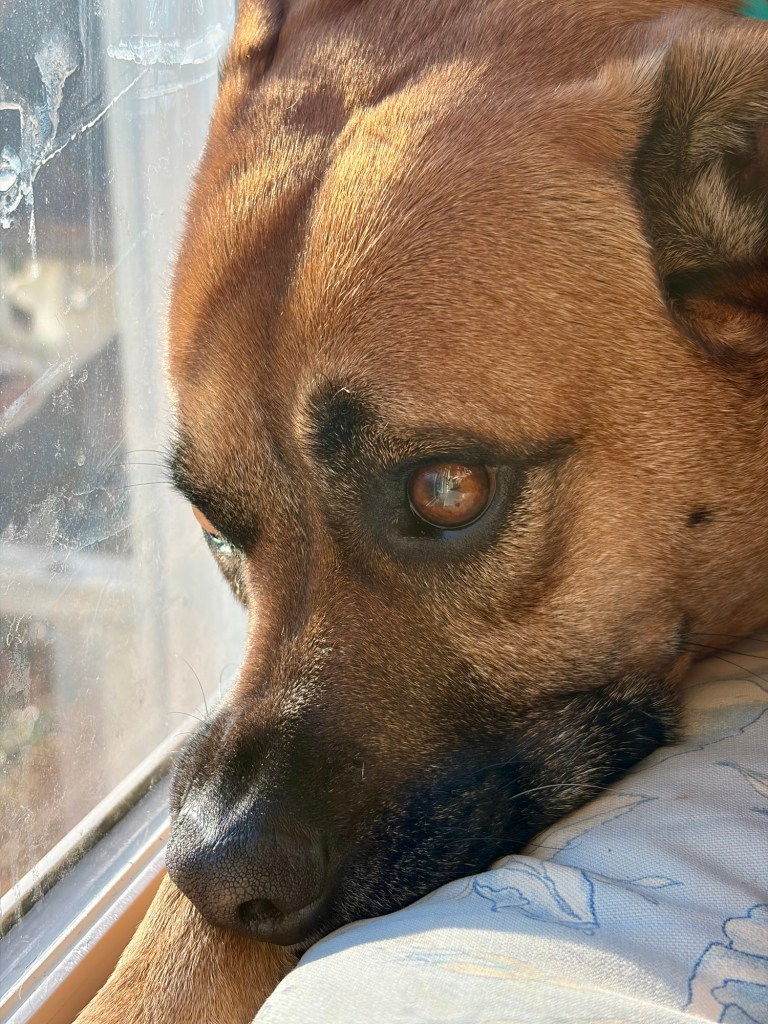 I can see myself in his eyeball. Handsome boy with pretty eyes. You can see where he puts his nose on the window haha yucky. Did some work in the yard, general walking around and thinking about yard stuff. Raked leaves into the driveway so I could leaf blow them down the driveway and into the woods. As soon as I was done raking and started leaf blowing, the wind started to blow in the opposite direction. Like as soon as I used the leaf blower. Worked on my taxes, worked in the yard. Productive peaceful day at home. Bye for now!